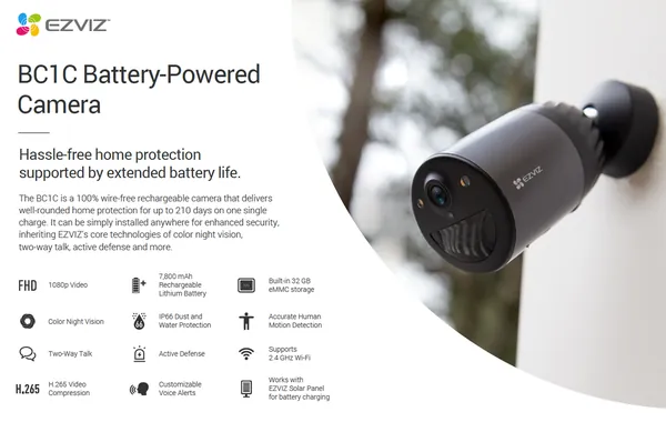 - The BC1C is a 100% wire-free rechargeable camera that delivers well-rounded home protection for up to 210 days on one single charge. It can be simply installed anywhere for enhanced security, inheriting EZVIZ's core technologies of colour night vision, two-way talk, active defense and more.