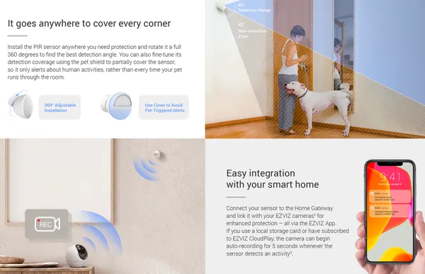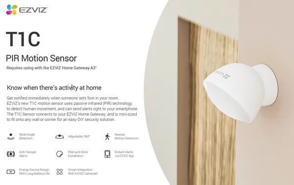 - the PIR sensor T1C can’t work independently, it requires the EZVIZ Home Gateway A3 to work properly. It can be conveniently added to your EZVIZ alarm system for expanded protection. You will be notified of any detected activity, all through the EZVIZ App.