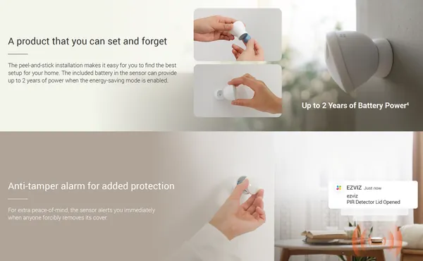 - The peel-and-stick installation makes it easy for you to find the best setup for your home. The included battery in the sensor can provide up to 2 years of power when the energy-saving mode is enabled.