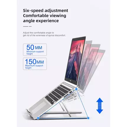 Features Adjustable multi-layer structure Aluminum alloy bracket, fast heat conduction, wear-resistant and scratch-resistant For all size laptops This laptop stand keeps the laptop stable and anti- skid silicone pads surrounds to everywhere to protect the laptop from scratches. It is not only use laptop stands but also a tablet or mobile stand or a book stand which can be use as pre your desire. The ventilated laptop stand increases airflow to help keep your notebook cool and protect it from overheating and crashes. The heights of the laptop screen can be adjusted independently upto 7 eye level, It’s scientifically designed to correct postures and reduce your neck fatigue, back pain, and eye strain. Very comfortable for working at home and office. Built-in legs which can adjust its height and can be stable enough to place a keyboard and it won't spill, you can release your hand when watching. The design is good enough to keeps your desk tidy. Made from premium aluminum alloy and designed in an X shape, the laptop riser can easily hold up to 5 kgs of weight Mounted on a large surface, it secures your device and lets you type without shaking while its smooth edges prevent hurting your hands Five adjustable angles (15 to 45 degrees) enable you to bring the laptop to your level of comfort Ergonomic design lets you fix your posture and reduce neck fatigue, back pain and eye strain . Absorbs and discharges heat easily and offers space for air flow to prevent laptop overheating Foldable to the compact size of 9.68x2.28 inches; may be placed in the portable storage bag (included) and carried anywhere