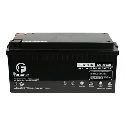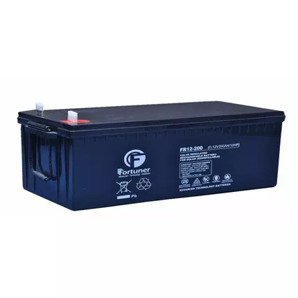 Fortuner Deep Cycle Solar Battery FR12-200D Description The FORTUNER sealed lead-acid rechargeable battery is non-spillable and maintenance free. A VRLA (valve regulated lead acid) battery is a starved electrolyte AGM type battery and has a safety valve which prevents excessive build up of gas pressure inside the battery. Valve-regulated lead acid batteries rely upon internal gas recombination to minimize electrolyte loss over the life of the battery, thereby eliminating the need for re-watering. A lead-acid battery has lead positive plates, lead oxide negative plates, and an electrolyte which is a solution of sulfuric acid and distilled water. The plates and the plate separator material between them are arranged in plate packs in plate compartments. VRLA batteries are particularly suited for remote back-up power applications because they do not require the same type of periodic maintenance required by flooded cells. These differing maintenance requirements provide cost savings. Feature Sealed Maintenance Free: No need for checking Electrolyte level and topping throughout its life. Sealed construction ensures no leakage of Electrolyte from Terminal or casing. Free from Orientation Constraints: The sealed construction with immobilized Electrolyte allows the battery to be installed in any position, horizontal, vertical, sideways- without any effect on its performance. Eco Friendly: The unique gas recombination Technology effectively nullifies generation of gas during normal use. It is totally Eco friendly, ensuring clean and safe environment. Minimal Voltage Drop: Since battery emits no gases or fumes, it can be placed adjacent to the UPS system or other electronic equipment, ensuring minimal voltage drop between battery and equipment. Easy Handling – Easy Installation: Lightweight and compact. Modular construction, easy to install and easy to connect and commission. Ready to Use: Available in fully (factory) charged condition. Good Service Life: Between 3 to 5 years life for small and medium monopoly ranges depending on cyclic/floats applications. Low Self Discharge: Self discharge very low as compared to conventional flooded batteries. Charge Retention & Recovery: Excellent charge retention and recovery ability due to special design of plates and separators with an absolutely balanced electrolyte. Superior High Rate Discharge: Very low internal resistance and very high electrolyte- active material reactive interface- allows very high currents for short and medium duration. High Reliability: Tough construction and heavy Duty Design with superior corrosion resistant lead calcium tin alloy.
