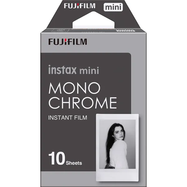 This single pack of FUJIFILM INSTAX MINI Monochrome Instant Film contains 10 sheets of instant black & white film that is compatible for use with the FUJIFILM INSTAX MINI series of cameras or INSTAX SHARE printers. This film features neutral gray tonality and normal contrast with natural shadow and highlight response when used under daylight or electronic flash lighting conditions. A refined grain structure provides high image sharpness and clarity as well as a versatile ISO 800 film speed for use with a wide variety of subjects. Each sheet of film produces a 2.4 x 1.8" glossy image area that is surrounded by a simple white border. Quick, instant developing is possible when working in temperatures between 41-104°F.