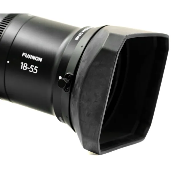 This Lens Hood Hood for MK18-55mm T2.9 Lens from FUJIFILM has been specifically designed to fit all mount variations of the MK18-55mm T2.9 cine zoom lens and features a square shape to maximize the amount of coverage provided without protruding into the frame. It provides some impact protection, and the inside of the hood is lined with anti-reflective coating to improve clarity and prevent flares.