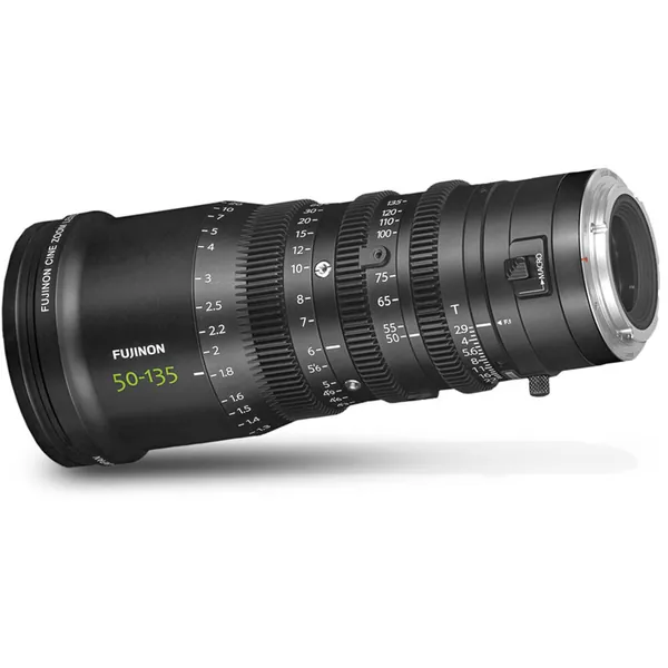 The Fujinon MK-R 50-135mm T2.9 Cine Zoom Lens is a lightweight cine-style zoom lens for Canon RF mount cameras with a Super35-sized sensor, mirrorless cinema cameras such as the Canon C70, and cinema cameras such as the RED KOMODO. It features a mechanical design with three independent lens control rings: focus, iris, and zoom. Each ring incorporates a cine-style gear with a 0.8 MOD for interfacing with standard cine-style lens accessories. The focus ring features 200° of rotation, which gives room for precise focus pulls, and the iris is clickless, enabling smooth iris pulls. The lens also incorporates a macro mode for close focusing capabilities.
