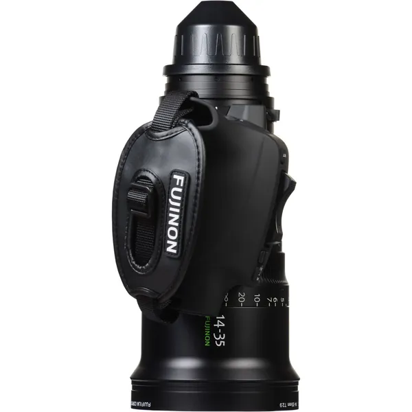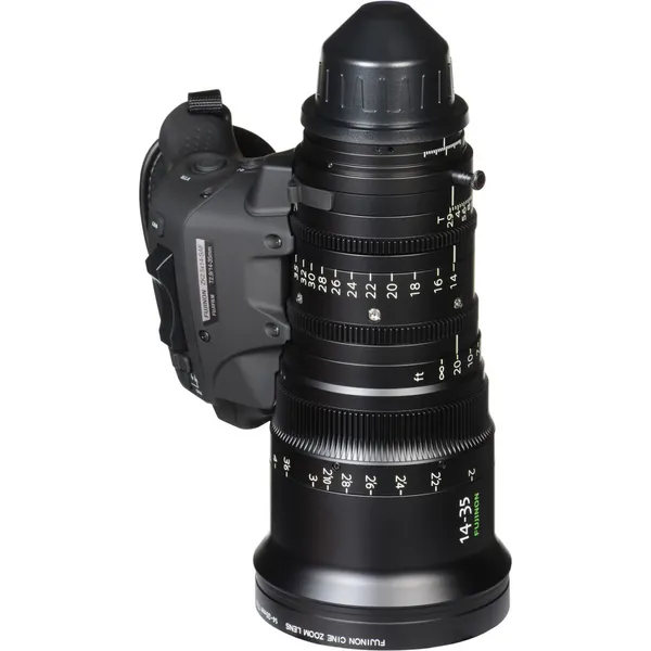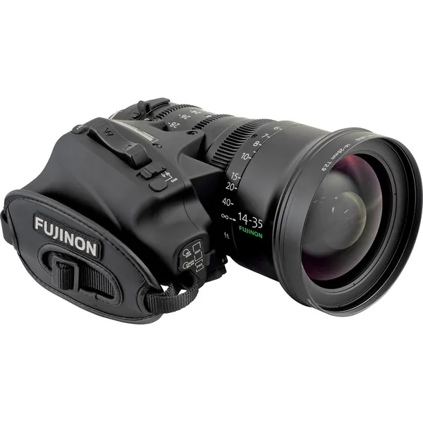 The Fujinon ZK14-35mm T2.9 Cabrio Lens is a wide to telephoto zoom lens for Super 35mm cameras, and it features a PL mount. The focus, zoom, and iris barrels are geared with standard 0.8 film pitch, which provides an interface for the removable ENG-style digital drive unit. The rear PL mount features electrical contacts for sharing Arri LDS and Cooke /i Technology lens data with the camera.