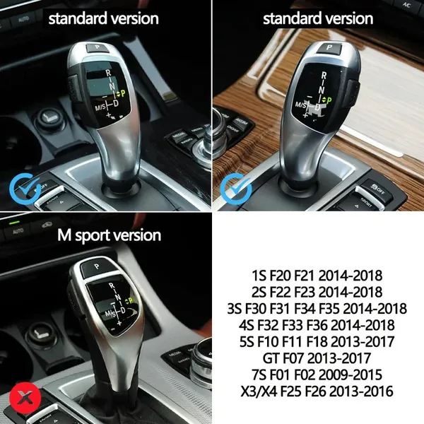 COMPATIBLE WITH BMW 1 SERIES F20 F21 2014-2018 2 SERIES F22 F23 2014-2018 3 SERIES F30 F31 F34 F35 2014-2018 4 SERIES F32 F33 F36 2014-2018 5 SERIES F10 F11 F18 2013-2017 5GT F07 2013-2017 7 SERIES F01 F02 2009-2015 X3 X4 F25 F26 2013-2016 CAR GEAR SHIFT KNOB TRIM COVER