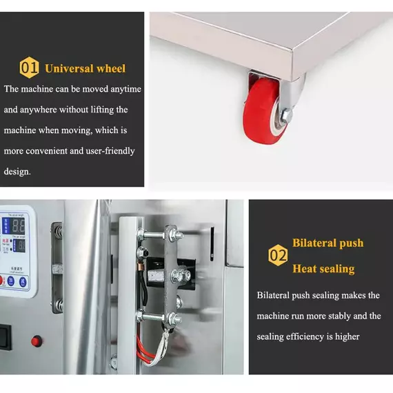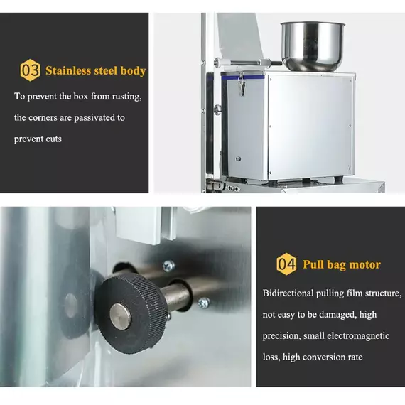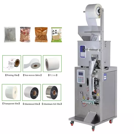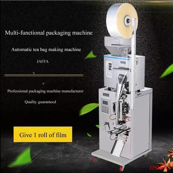 Features: Computer PLC control and automatic alarming function. English or Chinese screen display, easy operation. High sensitivity photoelectric eye color tracing,more accuracy. Bag typecan be customised to 3 sides sealing, 4 sides sealing, pillow bag, stand up pouch and long stick bag. Famous brand components, ensure the quality and durability of machine. Weight measuring, bag making, filling, sealing, cutting and bags counting can be done automatically. Ribbon code printer, link-bag device is option. Multipurpose packaging, suitable for various packaging of different product Specifications: Product name: Automatic packaging machine\ Voltage: 110V/220V Power: 500W Packing speed: 10-25 bags/min (depending on the material) Error range: ±0.2g (depending on the material) Package weight: 1-100g (various weight ranges can be customized) Bag making width: 1-10cm (fix one size) Bag making length: 1-16cm (free adjustment within the range) Machine size: 42*50*145cm Machine weight: 65kg Scope of trial: whole grains, hardware accessories, electronics, accessories, tea, scented tea, Chinese medicine powder, seasoning, powder, granules, etc. (non-sticky items)