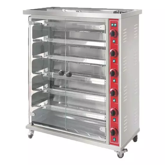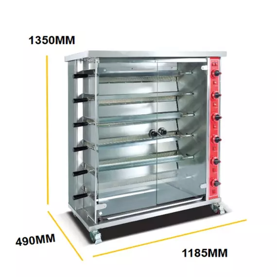 Features Stainless steel body, hygiene and durable. High-performance burner to make a balance distribution of heat. Equipped with exhaust fan to reduce the temperature. Convenient to observe the roasting process and have good heat insulation, ensure good taste. Specifications: Product Name: Gas Oven Applicable: Outdoor, Hotel, Commercial Application: Chicken, Duck and Meat Upto 25pcs of Chicken Model: CY-6P Power: 0.3kW Voltage: 220V/50HZ Certification: CE Power Source: Gas, LPG Process: Thermal Processing Automatic Grade: Automatic Material: Stainless Steel Roast Temperature: 50-300°C Heating Type: Heating Tube Machine Dimensions: 1185*490*1350mm