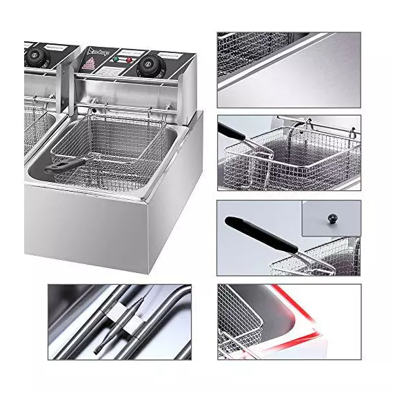 This stainless steel fryer is durable for both home and commercial use. Features Easy to use and clean. Temperature indicator light displays when the fryer is heating the oil It is ideal for cooking french fries, onion rings, egg rolls, fried chicken, panko shrimp, and any other deep fried foods. Residue plate for filtering out the dregs Heavy-duty stainless steel construction. Dual electrical heads and power plugs for a single large capacity tank application. Thermostats for precise temperature adjustment. U-shaped stainless steel heating tubes for quick & even heat distribution. Lid cover prevents the boil oil splashing and safely covers the oil when not in use The fryer basket with plastic handle on each side prevents scalding of your hands and brings safe and easy operation Thickened tank for durable use 2 hooks on the basket for easy hanging on the bar. The tank can be disassembled for easy cleaning. 4 feet for good stability on the countertop. Specifications: Maximum power: 5000 W (2500 W for each head). Tank capacity: 12.7QT/12L Voltage: 110V. Frequency: 60Hz. Temperature range: 140.0F - 392.0F. Overall Dimensions: 21.7 x 17.3 x 12.2in (L x W x H). Tank Dimensions: 11.8 x 9.4 x 5.9in (L x W x H). Basket dimensions: 8.3 x 7.3 x 4.1in (L x W x H). Handle length: 8.3" / 21.5cm Power cord length: 55" / 1.4m / 4.6ft. Weight: 15.43lbs / 7kg Brand: ZOKOP. Package Includes: 2 Single Tank Deep Fryers.