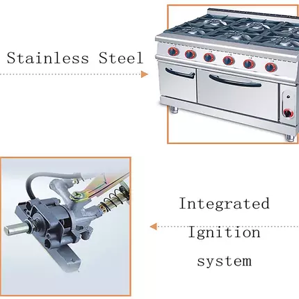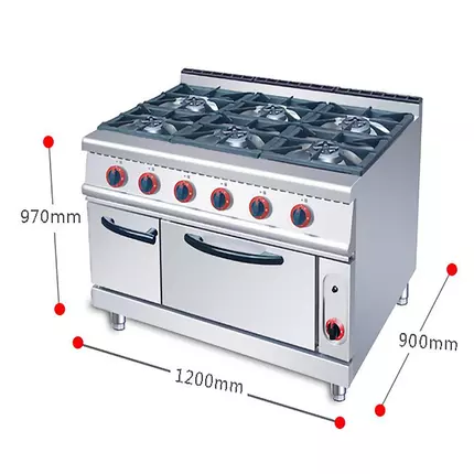 Features: Commercial kitchen cooker gas stove Gas stove adopts high-efficiency burners ensuring high efficiency and price-performance ratio, the built-in flame failure protection device ensures the safety. The double-layer design of thickened plates ensures, Anti-skid scaffolding, durable, adjustable height heating, safe and reliable, prevent dry burning. High stiffness and toughness of the cooker, making it durable and tenacious. Burner adopts combustion construction of fire out from side, to stop oil or water spilled out to block fire holes. Stove works stably. Flame sense of security device. Explosion-proof ignited fire device. Accidental flameout protection device. Easy to clean Technical Details Model: FSG-776 Type: Gas Cooktops Fuel Type: Natural Gas Material: Stainless Steel Number of Burner: 6 Panel Material: Stainless Steel Ignition Mode: Electronic Ignition Dimensions: 1200 x 900 x 920mm Inner Oven Size: 560 x 700 x 270mm N/W: 208kg Power: 88992.8BTU/Hour