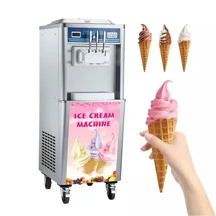 Soft serve machines work by taking a liquid ice cream mix and simultaneously agitating it as well as freezing it . Depending on the machine and the type of mix, the time it takes to finish converting a liquid mix to soft serve ice cream ranges from 15-30 minutes. Pairing precision engineering with a smart, common-sense design, this two flavor floor model soft serve freezer will give your customers the ice cream, frozen yogurt, custard, and sorbet they crave, and give you the simple operation you need to keep your business running smoothly! It can dispense three different flavors. Specifications: Type: Soft Serve Ice Cream Machines Output: 25 litres per hour Frequency: 50 Hz Phase: Single Phase Usage/Application: Restaurants Country of Origin: Made in India Technical Details Capacity for Freezing Bowl: 2*1.8 L Capacity for Mix Hopper: 2*5.8 L Power: 1.7 KW Voltage: 220V50HZ Refrigerant: R404a/R22 Production: 12~18 KG/Hour ( 17-28 L/Hour) Output of Cups: 200~300 Cups/Hour Weight: 145 KG Size: 520x745x1435mm