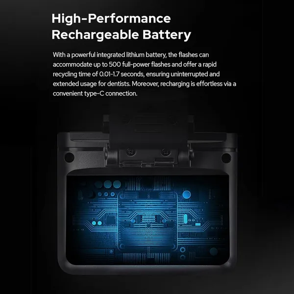 - Built-in rechargeable lithium battery with 500 full-power flashes