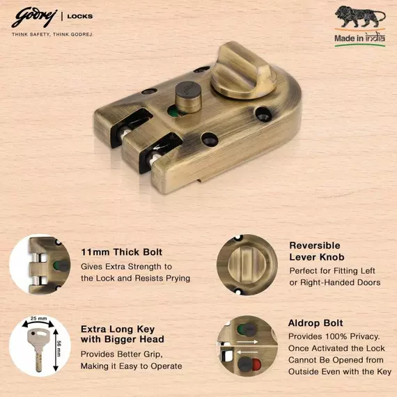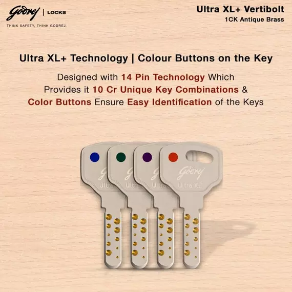 Features 11mm thick bolt: Thicker bolt ensure more resistant to burglar attack Ultra XL+ technology: This 14 pin technology provides 10 crore key combinations which makes it extremely difficult to duplicate the key Vertical Locking bolt movement : The vertical action of deadbolts gives more safety Bigger key head with color button: Provides better grip and helps in differentiating key of one user from another user Specification: Brand: Godrej Special Features: Keyless Entry Lock Type: Key Lock Material: Mazak (Zinc Alloy) Dimensions: 12.6 x 7.4 x 4.6 centimeters