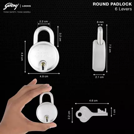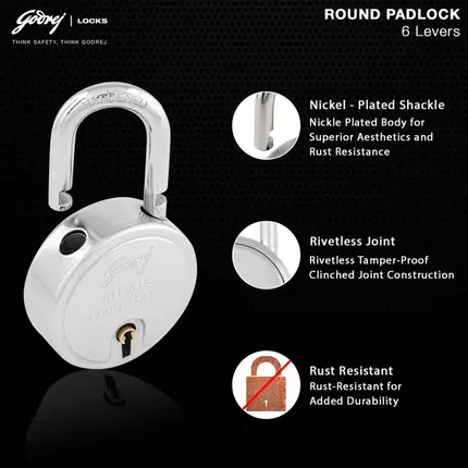Godrej Round Padlock 6Lever 50mm with Double Locking System for Door with 3 Keys, Strong Steel with Rivetless Body and Electroplated Shackles Give The Lock Extra Strength and Toughness Steel Finish 81