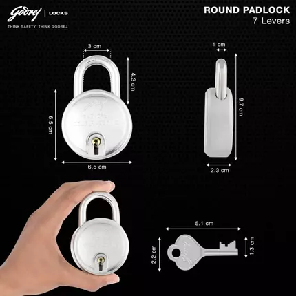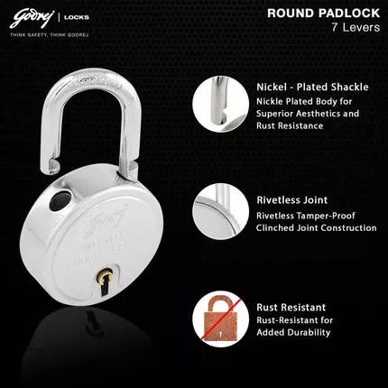 Godrej Round Padlock 7Lever 67mm with Double Locking System for Door with 3 Keys, Strong Steel with Rivetless Body and Electroplated Shackles Give The Lock Extra Strength and Toughness Steel Finish 81