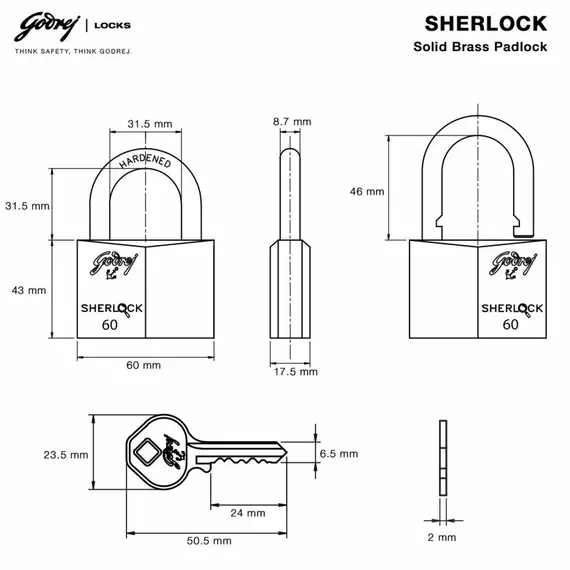 Features Type: Padlock Material: Brass Mechanism: High-precision brass pin tumbler mechanism Technology: Anti-pick technology to enhance security Hardened shackle: The material with double locking mechanism is toughened to resist the strongest of attacks Secure: Shackle gets engaged at both ends for greater security Specifications Brand: Godrej Special Feature: Easy to Install Lock Type: Padlock Item Dimensions LxWxH: 8.3 x 6 x 1.8 Centimeters Material: Brass