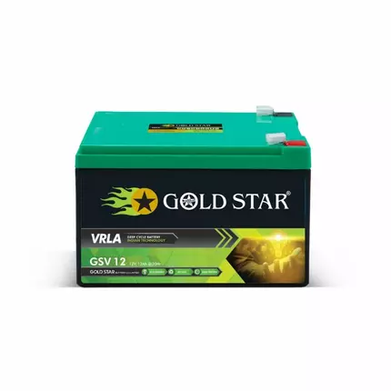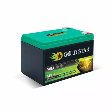 Battery container and cover are in ABS plastic Features Maintenance free & no-spillable sealed construction Advanced AGM technology ensures maintenance free operation. Usage of high grade pure raw materials ensures low self discharge and long self life. Low internal resistance and efficient discharge characteristics. Sealed construction of the battery allows perfect operation in any positions. Major Failure Mode Deep discharge can cause permanent damage to the battery Improper charging can cause battery damage Fast rate of charging and fast rate of discharging effect on battery life. Operation of the battery at a very high temperature can cause damage to the battery. Battery is kept in under charged condition for a long time causes damage to the battery. Avoid shot circuit and lose connection can cause permanent damage to the battery. At the time of installation/commissioning of the battery, ensure the battery is fully charged before putting on load. Follow manufacturer's guidelines in this regard. Specification: Brand: Goldstar Voltage (Volts):12 V Battery Type: GSV 12 Warranty: 12 Months Size (LxWxH): 152 x 99 x 95mm Maximum Charging Current (A) @20% Capacity: 2.4 Stand by Mode (V): 13.5 to 13.8V at 27°C (80°F) Cycle Mode (V): 14.1 to 14.4V at 27°C (80°F) Gross Battery Weight with Packing : 3.7