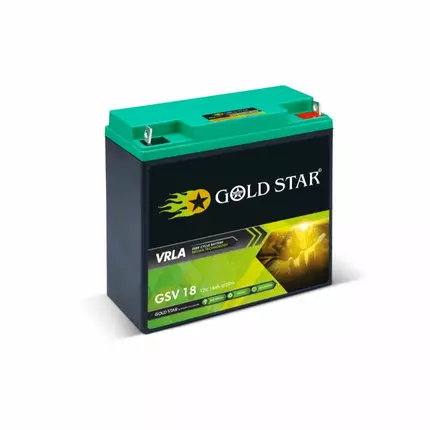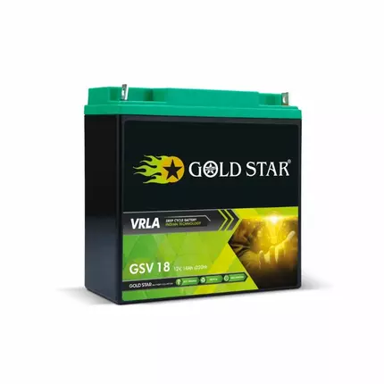 Battery container and cover are in ABS plastic Features Maintenance free & no-spillable sealed construction Advanced AGM technology ensures maintenance free operation. Usage of high grade pure raw materials ensures low self discharge and long self life. Low internal resistance and efficient discharge characteristics. Sealed construction of the battery allows perfect operation in any positions. Major Failure Mode Deep discharge can cause permanent damage to the battery Improper charging can cause battery damage Fast rate of charging and fast rate of discharging effect on battery life. Operation of the battery at a very high temperature can cause damage to the battery. Battery is kept in under charged condition for a long time causes damage to the battery. Avoid shot circuit and lose connection can cause permanent damage to the battery. At the time of installation/commissioning of the battery, ensure the battery is fully charged before putting on load. Follow manufacturer's guidelines in this regard. Specification: Brand: Goldstar Voltage (Volts):12 V Battery Type: GSV 18 Warranty: 12 Months Size (LxWxH): 180 x 77 x 171mm Maximum Charging Current (A) @20% Capacity: 3.6 Stand by Mode (V): 13.5 to 13.8V at 27°C (80°F) Cycle Mode (V): 14.1 to 14.4V at 27°C (80°F) Gross Battery Weight with Packing : 5.4