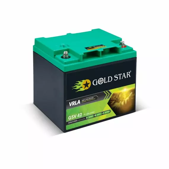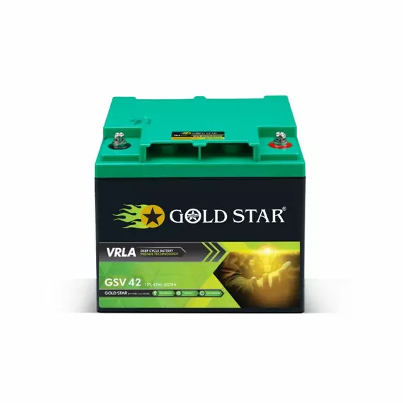 Battery container and cover are in ABS plastic Features Maintenance free & no-spillable sealed construction Advanced AGM technology ensures maintenance free operation. Usage of high grade pure raw materials ensures low self discharge and long self life. Low internal resistance and efficient discharge characteristics. Sealed construction of the battery allows perfect operation in any positions. Major Failure Mode Deep discharge can cause permanent damage to the battery Improper charging can cause battery damage Fast rate of charging and fast rate of discharging effect on battery life. Operation of the battery at a very high temperature can cause damage to the battery. Battery is kept in under charged condition for a long time causes damage to the battery. Avoid shot circuit and lose connection can cause permanent damage to the battery. At the time of installation/commissioning of the battery, ensure the battery is fully charged before putting on load. Follow manufacturer's guidelines in this regard. Specification: Brand: Goldstar Voltage (Volts):12 V Battery Type: GSV 42 Warranty: 12 Months Size (LxWxH): 197 x 165 x 170mm Maximum Charging Current (A) @20% Capacity: 8.4 Stand by Mode (V): 13.5 to 13.8V at 27°C (80°F) Cycle Mode (V): 14.1 to 14.4V at 27°C (80°F) Gross Battery Weight with Packing : 12.9