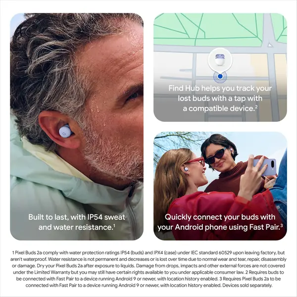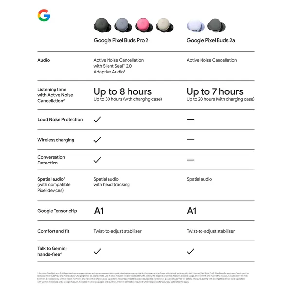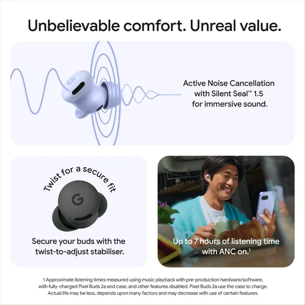Inspired by the design of Pixel Buds Pro 2, Pixel Buds 2a deliver lightweight comfort, crisp audio, Active Noise Cancellation with Silent Seal 1.5 and an all-day battery with the charging case.1 Plus, with the twist-to-adjust stabiliser, just twist the buds to get a more secure fit.