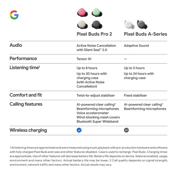 2 Available only on Pixel Tablet and Pixel 6, and newer Pixel phones (excluding Pixel A-series phones). Devices sold separately. Requires the compatible app and supported content. See g.co/pixelbudspro/help for details.