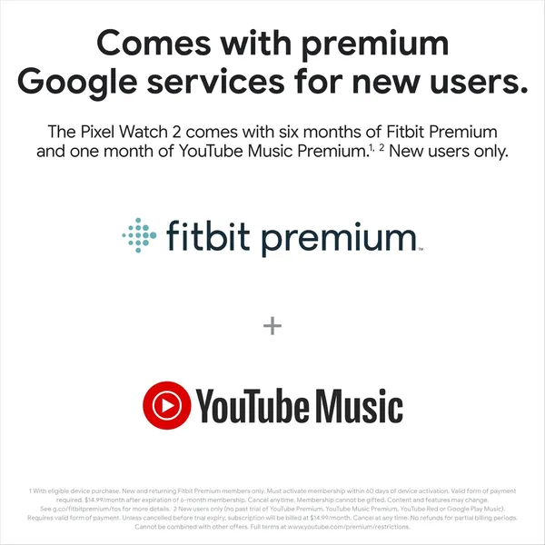 1 Works with most phones running Android 9.0 or newer and requires a Google Account, Google Pixel Watch app and Internet access. Some features require a Fitbit account and mobile app and/or a paid subscription. Google apps and services are not available in all countries or languages. See g.co/pixelwatch/specs for technical and device specifications.
