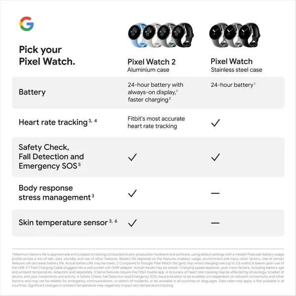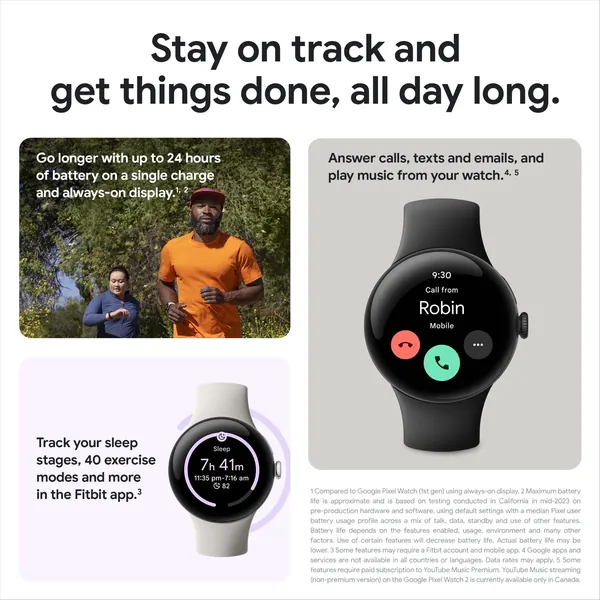 Meet the Google Pixel Watch 2, engineered by Google with the best of Fitbit.1 Helps you understand your health and fitness with Fitbit's most accurate heartrate tracking yet.2 See the best of Google at a glance, including Gmail and Calendar, and get peace of mind from personal safety features.3 And keep going with even longer battery life.4