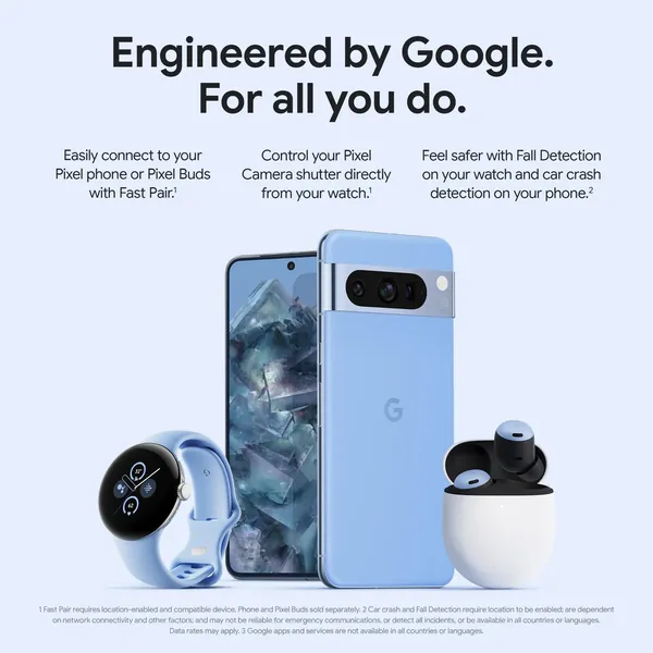 8 Fall Detection is not available in all countries and depends on network connectivity and other factors. Your watch may not be reliable for emergency communications. Fall Detection may not detect all falls. To call emergency services on a Google Pixel Watch without 4G LTE, your paired phone must be nearby. Users must grant location permission for Fall Detection to share location externally. Data rates may apply. See g.co/pixelwatch/personalsafety for more details.