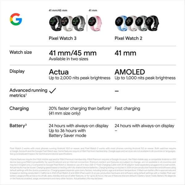 The Google Pixel Watch 3 is designed for performance.1 The cutting-edge Actua display isbigger, brighter and ultra responsive than before.2 Beat your best times with advanced runningfeatures from Fitbit, then use all-new readiness and cardio load tracking to balance rest. And