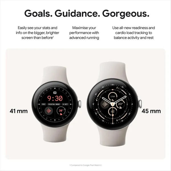 The Google Pixel Watch 3 is designed for performance.1 The cutting-edge Actua display isbigger, brighter and ultra responsive than before.2 Beat your best times with advanced runningfeatures from Fitbit, then use all-new readiness and cardio load tracking to balance rest. And stay on top of your day with help from Google.