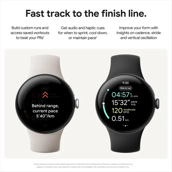 The Google Pixel Watch 3 is designed for performance.1 The cutting-edge Actua display isbigger, brighter and ultra responsive than before.2 Beat your best times with advanced runningfeatures from Fitbit, then use all-new readiness and cardio load tracking to balance rest. And  stay on top of your day with help from Google.