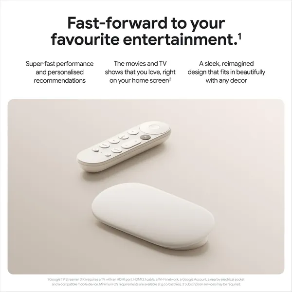 The Google TV Streamer (4K) delivers your favourite entertainment quickly, easily, and personalized to you.1,2 Get fast performance, responsive navigation, and tailored recommendations from Google’s most advanced streamer yet. And all your content is organized for you in one place, so you’ll do a lot less searching and way more watching.