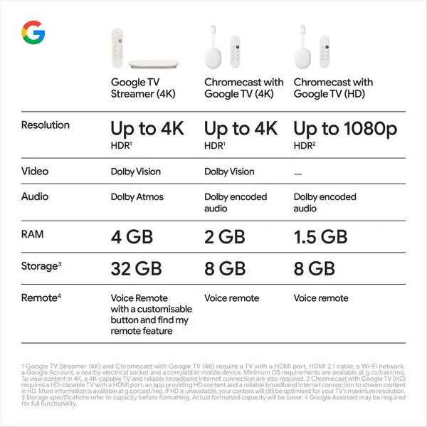 1 Google TV Streamer (4K) requires a TV with an HDMI port, HDMI 2.1 cable, a Wi-Fi network, a Google Account, a nearby electrical outlet, and a compatible mobile device. Minimum OS requirements are available at g.co/cast/req.