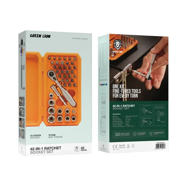 The Green Lion 42-IN-1 Ratchet Socket Set serves as a complete tool collection for precise work and lasting durability. The high-quality ABS, metal, CRV, and S2 components deliver outstanding strength with extended service life. The ratchet mechanism contains 72 teeth which enable smooth and efficient functioning through minimal physical exertion. The tool delivers 70 N.m of maximum torque power to handle both demanding and sensitive work. The set contains 30 screwdriver bits and 9 six-point sockets with sizes from 5mm to 13mm thus providing multiple tool options for different tasks. The 42-piece set contains all necessary tools for repair work assembly tasks and installation projects in one box. The installation process of bits and sockets is simple so users can make quick adjustments without any complications. The compact design together with its high functionality makes this socket set an essential tool for workshops as well as home repair kits.