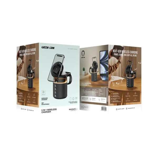 The Green Lion 5-in-1 wireless charger is a perfect all-in-one charging solution for your devices. It brings power and convenience into this sleek and compact design by incorporating multiple outputs, which include 15W, 10W, 7.5W, and 5W for the phone, as well as 5W TWS for earbuds, 2.5W for smartwatches, and 5W for the speakers. This comes with an integrated Bluetooth V6.0, and with the built-in 1800mAh battery, it makes for as many as 5 hours of continuous playtime over the speaker. It has 27W max input power, fast and efficient charging, 5V/3A or 9V/3A input. The "Snap & Charge" feature will certainly make placing your device extremely easy, and, of course, ambient light mode adds a touch of sophistication. Also, the speaker control buttons make managing your audio experience effortless. Perfect for home or office use, this versatile charger is designed to keep all your devices powered and ready.