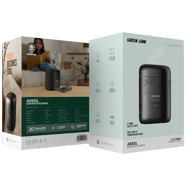 The Green Lion Aseel Bakhour Burner is an advanced and useful method of making your favorite fragrances very easily. The burner, which looks very stylish and elegant, distributes a strong aroma that transforms the air of your room into a relaxing atmosphere. The scent will go everywhere in the room due to the device's design which allows for broad area coverage. What’s more, to make usage peaceful and safe, the burner has an LED indicator that gives very clear feedback on operating status. Incense is supposed to be consumed at 250–300°C for the best result. Charging is via Type-C, which takes only two to three hours. One charge allows for eight to ten burning cycles. Aseel Bakhour Burner is an efficient and safe option. It has a burning time of 120 seconds and an automatic turn-off after 2 minutes. The product is made from tough ABS material. It has a nice appearance and can serve its function well. This makes it a perfect option for your home to bring in an aromatic atmosphere.