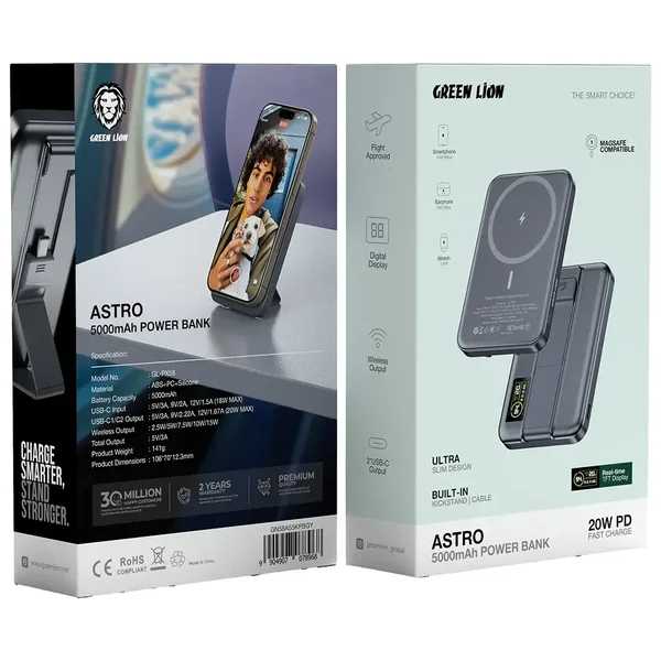 The Green Lion Astro 5000mAh Power Bank is a stylish and compact charging solution in the first place, and it has the capacity of 20W PD fast charging, which makes it the perfect choice for high-tech devices that need an instant power boost. The built-in kickstand allows you to not only charge your smartphone but also to watch or use it hands-free at the same time. The LED feature also serves to indicate and keep you informed continually about what is happening with the charging process. The 5000mAh capacity is sufficient to keep your devices running all day long, while USB-C connectivity ensures that your data is being transferred and charging is done quickly and efficiently. Therefore, this power bank is your trustworthy companion for charging devices, whether you are out or working from home. Its portable design means it won’t take up much space in your bag; thus, it becomes a must-have accessory for all those who value speed and convenience.