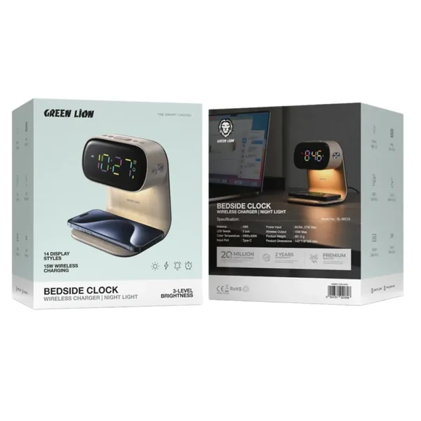 The Green Lion Bedside Clock with Wireless Charger combines practical style with upscale design. Made from durable ABS material and offering a wood grain appearance, the clock gives a cozy atmosphere to any bedside table. It comes with 5 LED beads and gives sharp visibility without glare. It supports up to 15W fast charging, making it compatible with most Qi-compatible devices. Touch and switch operation facilitates the use in a very user-friendly manner. Perfect to be placed at bedtime, it makes style and functionality blend harmoniously.