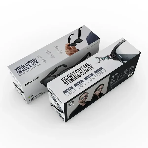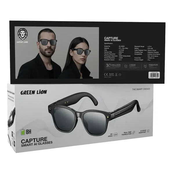 Beyond present smart wearables, the Green Lion Capture Smart AI Glasses take style to the forefront. Made of polymer-coated PC and zinc alloy, these glasses offer both durability and modern elegance. Capturing HD photos and 1200P videos with the IMX219 camera chip and 8MP lens (32MP interpolated) has become a passing breeze, forever engraving the memories unnoticed. To make the most of the Bluetooth 5.4 service, which offers an operational distance of over 12 meters, it allows for syncing with your phone to provide real-time translation, AI voice assistance, and seamless audio playback for up to 8 hours. Charging time is short for longer standby, thanks to magnetic charging; hence, you are never in a hurry. Designed with the Green Lion Capture Smart AI Glasses, comfort meets convenience, smart technology, and style.