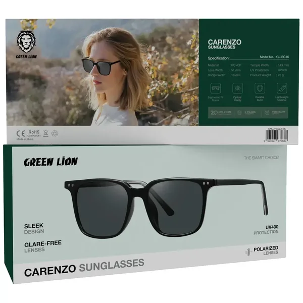 The Green Lion Carenzo Sunglasses - Black are a groundbreaking fashion statement for daily wear, incorporating all three features of luxury, comfort, and total eye honesty. The producer makes the sunglasses by utilizing highly durable materials called PC + CP, which give the user not only a long-lasting product but also a lightweight and ergonomic fit that can be worn comfortably for a long time. The 51mm polarized lenses coming with the sunglasses are perfect for outdoor activities as they offer the user excellent optical quality while simultaneously cutting off glare and causing less strain on the eyes. Moreover, combined with UV400 protection, it means your eyes are totally protected from the harmful effects of UVA and UVB rays, which makes the sunglasses good for driving, going to the beach, or just everyday sunlit outdoor adventures! The black color of the glasses, which is fashionable, will go beautifully with every outfit and will at the same time impart a touch of elegance and timeless fashion sense. Besides the 18mm bridge width and 143mm temple width, Carenzo Sunglasses provide a tight yet comfy fit for long wearing. Get the Green Lion Carenzo Sunglasses and flaunt the combination of fashion, durability, and performance - a perfect companion for both protection and style!