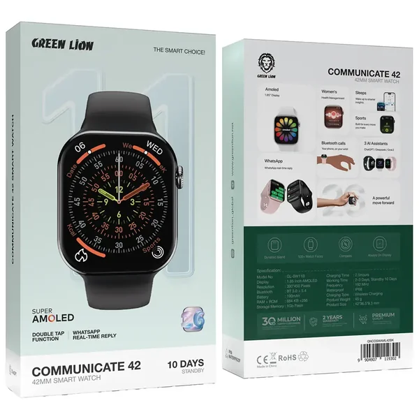 The Green Lion Communicate 42 Smart Watch 42mm is a perfect combination of beauty and state-of-the-art technology. The large 1.85-inch AMOLED display and 390×450 resolution produce extremely detailed and colorful visuals for all your notifications and apps. This smartwatch comes with 684 KB RAM and 256 MB ROM along with 1GB flash storage to run smoothly. The Bluetooth 3.0 + 5.4 guarantees an uninterrupted connection while the 190mAh battery allows 2-3 days of active use and 10 days of dormancy. It is user-friendly with its real-time reply for WhatsApp messages, double-tap feature and a dynamic island for easy navigation to get around. The IP68 rating for immersion in water gives the watch an exceptional resistance to water and makes it ideal for people with an active lifestyle. The 500+ watch faces, a compass and the always-on display make the Green Lion Communicate 42 the perfect wristwatch for those who want both elegance and practicality in their everyday gadgets.