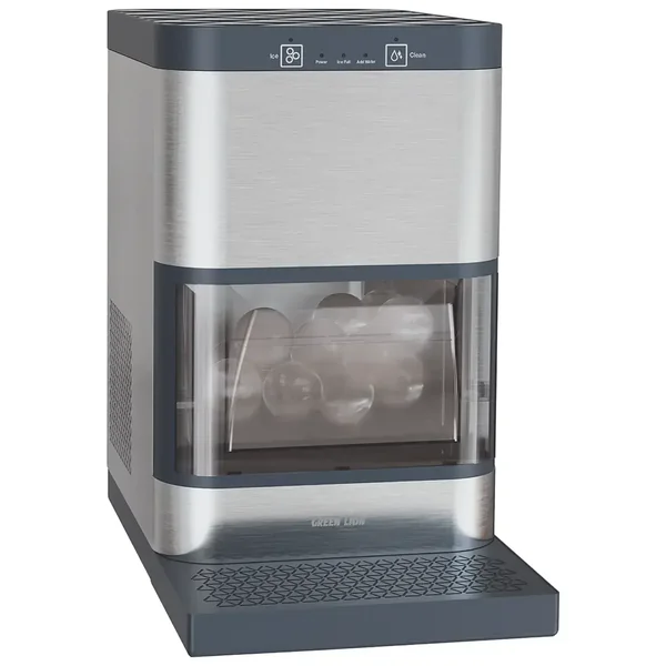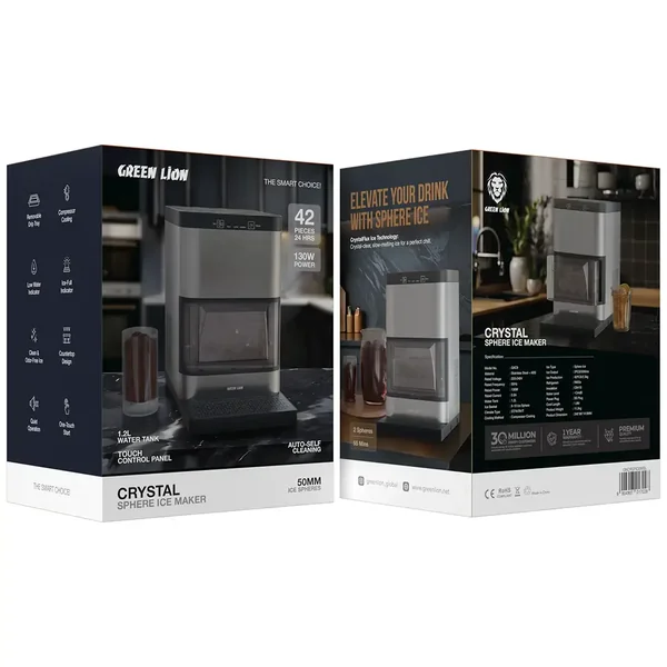 The Gray version of the Green Lion Crystal Sphere Ice Maker is an ice maker that will not only indulge your thirst but also serve as a decorative piece for your kitchen or bar. The durability of the stainless steel and ABS guarantees the maker's lifetime. The water tank capacity is 1.2L, and the ice production capacity per day is 42 spheres (2.3kg). The compressor cooling system has the capability of making 2 ice spheres every 55 minutes, which means there is always enough ice for your drink. The machine makes noise less than 54dB, which is very quiet, and the touch control panel, which is simple to use, enables one-touch start and auto self-cleaning. There are indicators for low water and full ice, which make it very convenient, as you already know when to refill or empty the basket. Its compact countertop design, removable drip tray, and clean, odor-free ice make it a convenient, efficient, and stylish choice for any occasion. The power rating of 130W and cord length of 1.8m make it suitable for daily use.