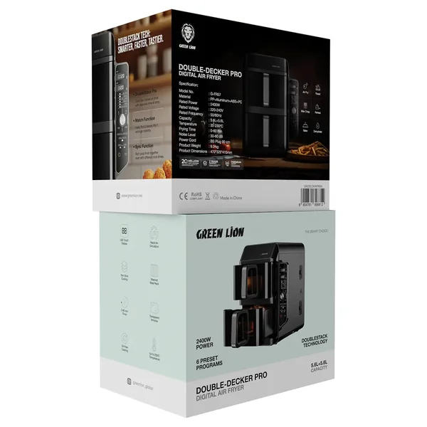 Green Lion Double-Decker Pro Digital Air Fryer is a designer-quality cooker with a lot of convenience and versatility. With a big 2400W power and 220-240V operating voltage, this air fryer cooks fast and efficiently. With double-size cooking capacity 5.6L + 5.6L, it can carry out cooking for a large family assembly. Temperature: 35-230°C, timer: 0-60min, LED touch display control system for easy operation of cooking parameters. The rapid air circulation and non-stick coating for gearless cooking ensure the least oil use for healthier cooking. The cook space is maximized by double-stack technology and a stacked meal rack, with an accompanying transparent window to see through your meal. The 6 presets and options for air fry, roast, bake, dehydrate, and so on make the Green Lion Double-Decker Pro Digital Air Fryer a complete cook companion.