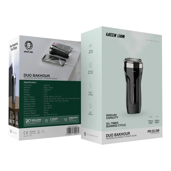 The Green Lion Duo Bakhour with 8000mAh Power Bank PD 22.5W provides a convenient and multi-functional solution for charging and burning your incense needs. This device is constructed from premium ABS and metal materials and is both long-lasting and practical. The inbuilt 8000mAh battery offers ample power for your devices, providing up to 18W of output and PD 22.5W via the Type-C output for quick charging. Type-C charging offers fast recharging with 3-5 charging hours with multiple selections like 5V/3A, 9V/2A, and 12V/1.5A. The output of USB-A charging is also fast charging up to a maximum of 18W. Green Lion Duo Bakhour contains a burning cycle of 50+ times with a temperature of 360-420°C. It incorporates charging protection, a smart chip, and an LED indicator to monitor easily. Safe, non-toxic, and auto power off after 90 seconds, it's the perfect blend of technology and heritage.