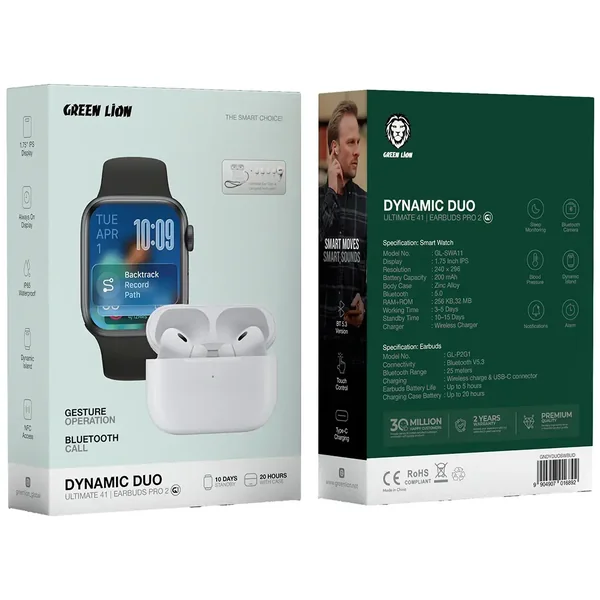 The Green Lion Dynamic Duo Earbuds & Smartwatch delivers a perfect combination of advanced technology through its Ultimate 41mm Smart Watch and Earbuds Pro 2. The 41mm Smart Watch includes a 1.75-inch IPS display with 240 x 296 resolution and always-on functionality. The device operates on Bluetooth 5.0 technology through its zinc alloy construction which provides 256KB RAM and 32MB ROM for stable performance. The device functions between three and five days before battery replacement becomes necessary and it can stay active for up to fifteen days in standby mode. The watch provides multiple functions which include sleep tracking, blood pressure monitoring, and dynamic island alerts to maintain your daily awareness. The Earbuds Pro 2 deliver Bluetooth V5.3 technology that enables users to achieve a maximum connection distance of 25 meters. Also this earbud offers five hours of uninterrupted playback. The charging case keeps earbuds charged for up to twenty hours. The charging case is both USB-C and wireless charging. These earbuds are IP65-rated waterproof. All these features make them ideal for those who enjoy fresh tech.