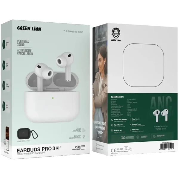 The Green Lion Earbuds Pro 3 True Wireless Earbuds - White not only present top-notch audio quality but also enrich your auditory journey with modern features. The G1+ chip, coupled with Bluetooth V5.4, gives the earbuds a significant power boost, and they further provide active noise canceling and 25-dB sound reduction to guarantee that the sound is clear and uninterrupted. You can go as far as 25 meters away from the source and still enjoy a perfect linking experience without any disruption at all. The charging case with a massive 300mAh battery can power the earbuds for more than 20 hours in total, while the individual earbuds are good for 5 hours of continuous playing time when fully charged. Users can choose between wireless and USB-C charging, both of which are equally convenient, although the total charging time might be between 70 and 100 minutes. The earbuds that are made to be gentle on the ears come with silicone ear tips and have a lanyard for easy carrying.
