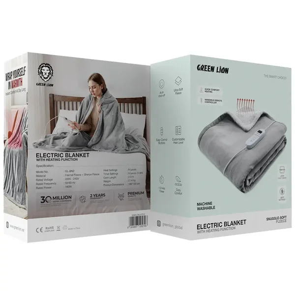 The Electric Blanket Green Lion in gray with Heating Function is the ultimate comfort source in winter. It has soft flannel fleece and sherpa fleece as the main materials, so it is a snuggle-soft experience, plus it has 9 customizable heat settings so that you can choose the one you like best. In addition, they have incorporated a handheld remote controller in the blanket for the user's convenience and a timer with 9 levels (1-9 hours) for extra comfort. The blanket is big enough to cover the entire body and to give a warm and comfy experience. The ability to machine wash is a great benefit, and the auto shut-off feature is an added safety measure to give peace of mind. This electric blanket is perfect for home use because it is quick and easy to use, it gives comforting warmth, and has adjustable settings, making it ideal for keeping you warm throughout the night. It is appropriate for any room because it combines comfort and practicality.