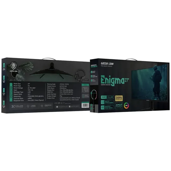 The Green Lion Enigma 27" Gaming Monitor is a powerful gaming tool, helping to build an immersive gaming experience with a 240Hz refresh rate and Full HD resolution, which gives smooth gaming and sharp visuals at the same time. The technology of AMD FreeSync does away with screen tearing, resulting in a gaming experience that is smooth and without interruptions. This monitor has an RGB lighting that can be adjusted according to your preference, revealing a great gaming atmosphere and the flair of your setup. Its wide-angle of viewing guarantees lifelike and brilliant images, no matter how the viewer sits, and the ergonomic design allows for comfortable, prolonged gaming hours. The monitor has a 1ms response time, thus making it the best choice for high-speed games, and the audio interface with a 3.5mm jack makes it easy for you to connect your headphones. Gamers who want both performance and good looks will find the Green Lion Enigma Gaming Monitor to be the perfect choice for their high-performance gaming rig.