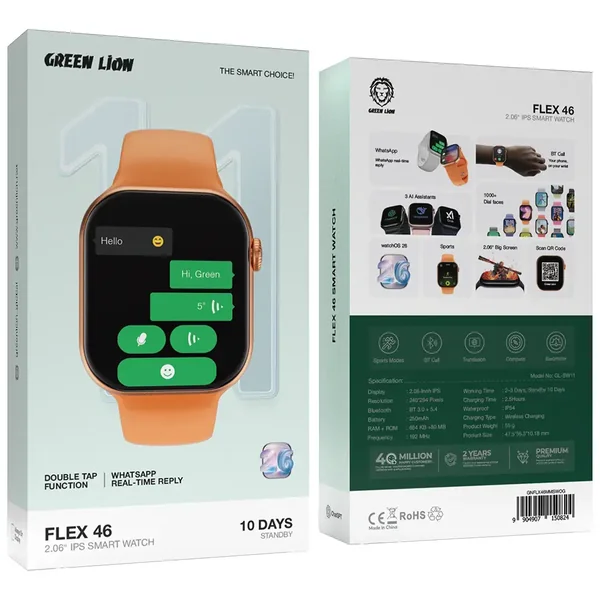 The Green Lion Flex 46 – 2.06" IPS Smart Watch - Black is a top choice for contestants seeking a fashion accessory that combines well-made performance and the latest technology in one gadget. The watch has a really large 2.06-inch IPS display, resolutely 240 × 294 and extremely clear and comfortable even for distant eyesight, so it runs very swiftly with a 192MHz processor, 684KB RAM, and 80MB ROM. With BT 3.0 + 5.4, you get a fast and reliable connection for Bluetooth phone calls, notifications, and even replies to WhatsApp messages at the same time. The 250mAh battery is strong enough to provide around 2–3 days of usage and even up to 10 days of standby, in addition to being wireless charging, which is very convenient. This smartwatch includes sports modes, a compass, a barometer, AI assistants, and WatchOS 26 for more user-friendliness. Plus, it offers a huge choice of more than a thousand dial faces, QR code scanning, and a double-tap feature for easy navigation. The Flex 46 is IP54 rated, which means it is resistant to water and dust, and therefore it is perfect for daily wear.