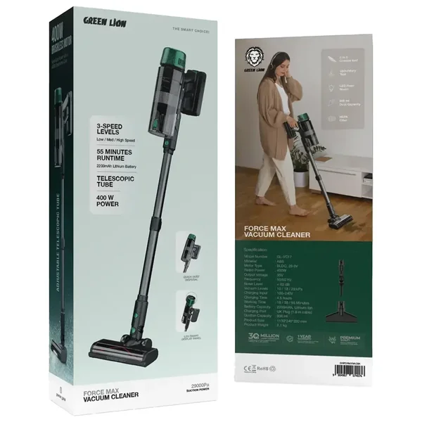 The Green Lion Force Max Vacuum Cleaner in Black is a power-driven home cleaning solution that is engineered to take off the hassle of maintaining your home. The vacuum is made of tough ABS materials and driven by a 400W BLDC motor at a voltage of 29.6V, which produces a strong suction power of 29000Pa while being below 82dB of noise. It has three different vacuum levels settings (10-18-29kPa) and thus, it can effectively clean all types of surfaces from dust to dirt and debris. The 800mL dustbin and the HEPA filter system in the Force Max ensure that even the smallest particles are trapped, thus providing a healthier indoor environment. The combination of tools comprising the 2-in-1 crevice and upholstery, an LED floor brush, supplies the quiet and thorough cleaning of corners, furniture, and floors. The telescopic tube provides long access, while the LED smart display panel alerts you to battery status and suction mode. The vacuum is powered by a 2200mAh lithium-ion battery, which gives the user an 18-55 minute run time and takes 4.5 hours to be fully charged using a UK plug. The Green Lion Force Max is very lightweight, portable, and very effective, combining state-of-the-art features with convenience in providing an excellent cleaning experience.